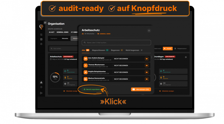 • Sie sehen wie audit-ready in <2 Minuten aussehen kann (Export/Übersicht).